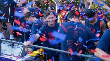 Celebración de los jugadores del FC Barcelona por las calles de Barcelona, después de conseguir el título de Liga 2015/16. —- FC Barcelona on Social Media Subscribe to our official…